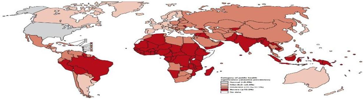 30 - 50 % der Menschheit hat Eisenmanel (Quelle: WHO). Die oben dargestellte, von der WHO veröffentlichte Karte zeigt vier Häufigkeits-Kategorien von Eisenmangelanämie bei Kindern im Vorschulalter: